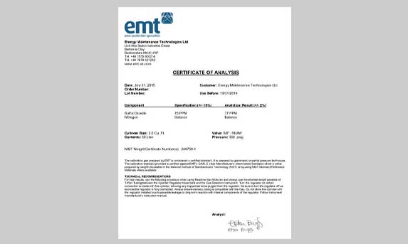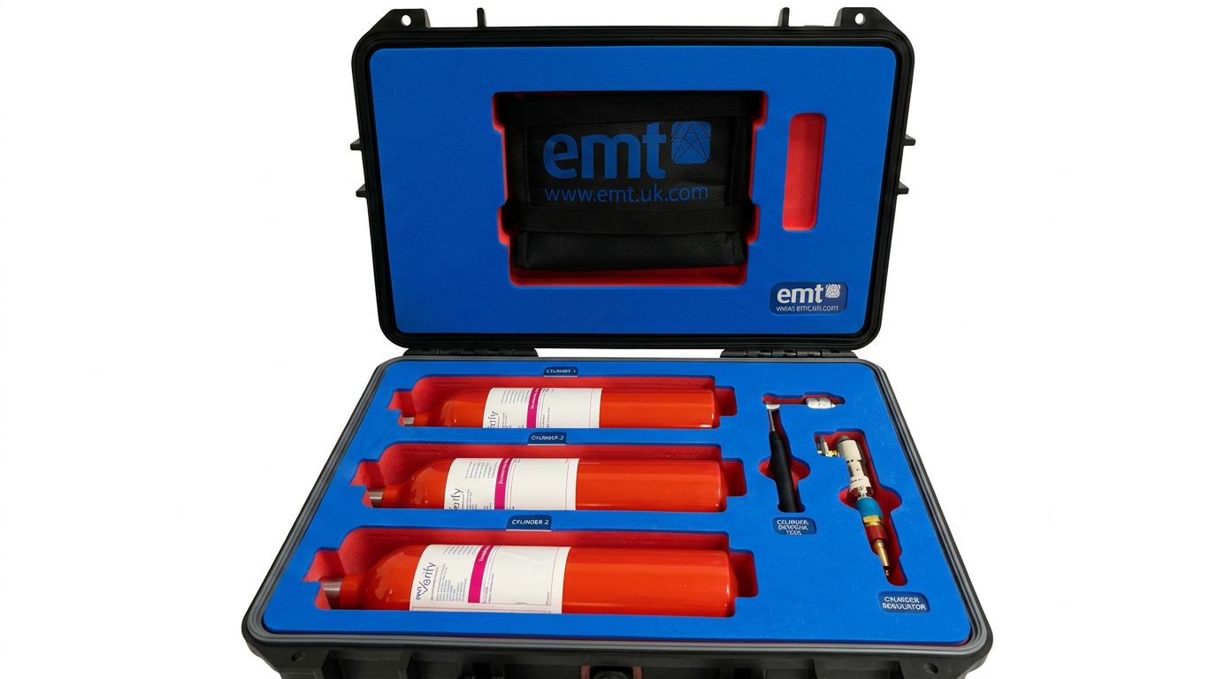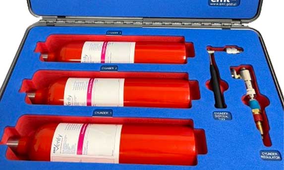 O kit starter EMT Verify é fornecido em cilindros de alumínio não recarregáveis de 116L com conexão 5/8”-18UNF (C10), dimensões de 10,8 cm diâmetro x 36,2 cm altura e peso de 1 kg. Inclui 3 cilindros específicos para o analisador, regulador de cilindro e maleta rígida protetora. Especificações chave por gás: